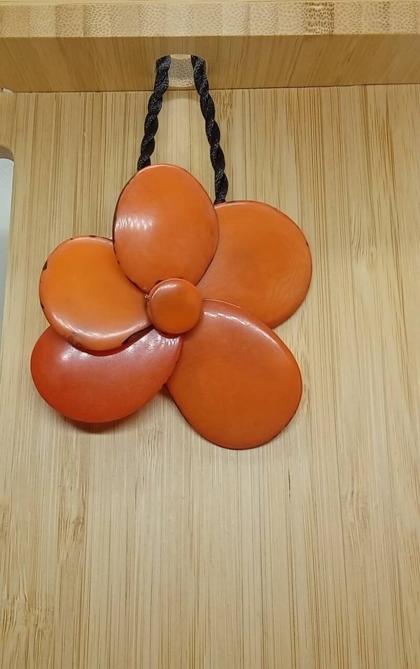 Pendentif fleur en ivoire végétal (graine de Tagua), dans des tons orange.